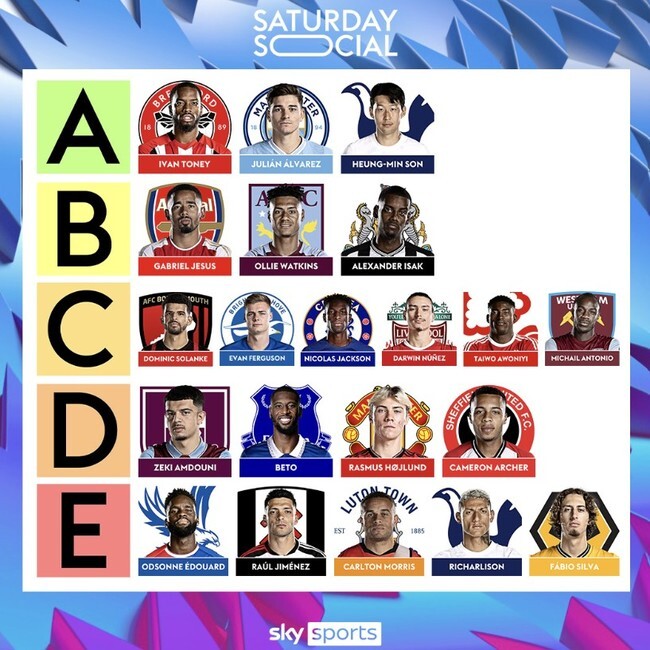B등급에는 가브리엘 제수스(아스날), 올리 왓킨스(아스톤 빌라), 알렉산더 이삭(뉴캐슬)이 선정되었고, 토트넘의 이번 시즌 실패작인 히샬리송은 E등급에 그쳐 최하위 공격수로 선정되었다.