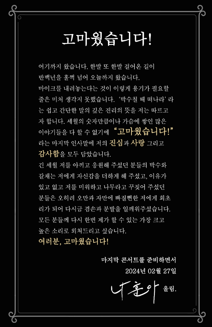 나훈아는 또한 "‘박수칠 때 떠나라’라는 쉽고 간단한 말의 깊은 진리의 뜻을 저는 따르고자 합니다. 세월의 숫자만큼이나 가슴에 쌓인 많은 이야기들을 다 할 수 없기에 ‘고마웠습니다!’라는 마지막 인사말에 저의 진심과 사랑 그리고 감사함을 모두 담았습니다."라고 은퇴를 언급하였습니다.