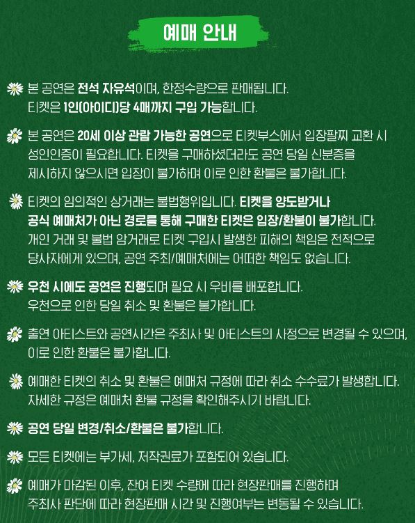 서울 파크 뮤직 페스티벌 티켓은 인터파크에서 구매할 수 있습니다. 티켓 부스 오픈 시간은 오후 12시부터 오후 9시까지이며, 모바일 티켓은 현장 티켓 부스에서 본인 확인 절차를 거친 후 입장 팔찌를 수령할 수 있습니다. 입장 팔찌 교환 시 예매자, 동반인 모두 신분증을 확인하오니 반드시 지참 바랍니다. (모바일 티켓 캡쳐본 및 사본 절대 불가) 모바일 티켓과 입장 팔찌는 재발행이 불가합니다.